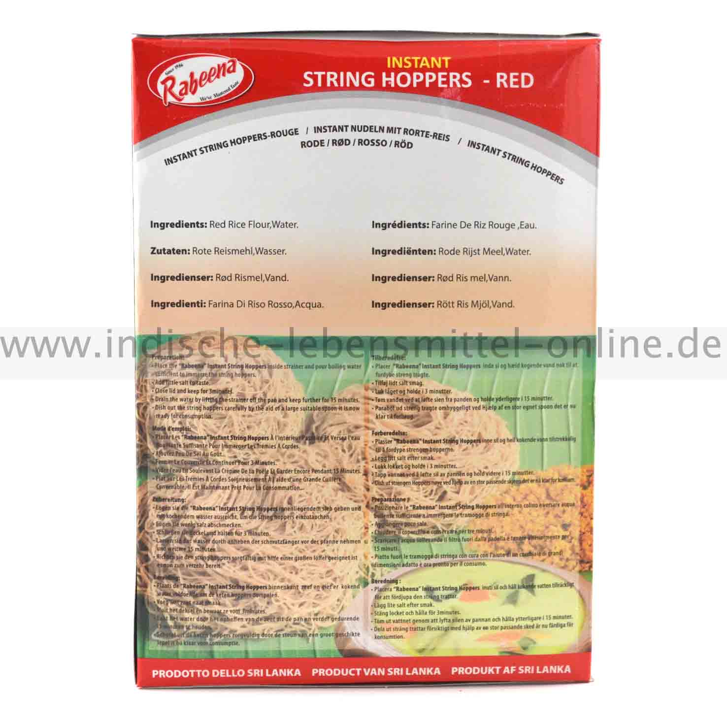 Instant String Hoppers, is used to prepare white string hoppers. In olden days,it is made from rice noodles curled into flat spirals,but it is time consuming process.By using this mix,can prepare string hoppers with in few minutes. It is served for breakfast with a thin fish or chicken curry, containing only one or two pieces of meat, a dhal dish, and a spicy sambol or fresh chutney. String hoppers are made from steamed rice flour made into a dough with water and a little salt, and forced through a mould similar to those used for pasta to make the strings. They are cooked by steaming. These hoppers can be bought ready-made. The Indian and Sri Lankan population eats String Hoppers for breakfast or dinner. There are many variations to this, depending on the type of flour used.